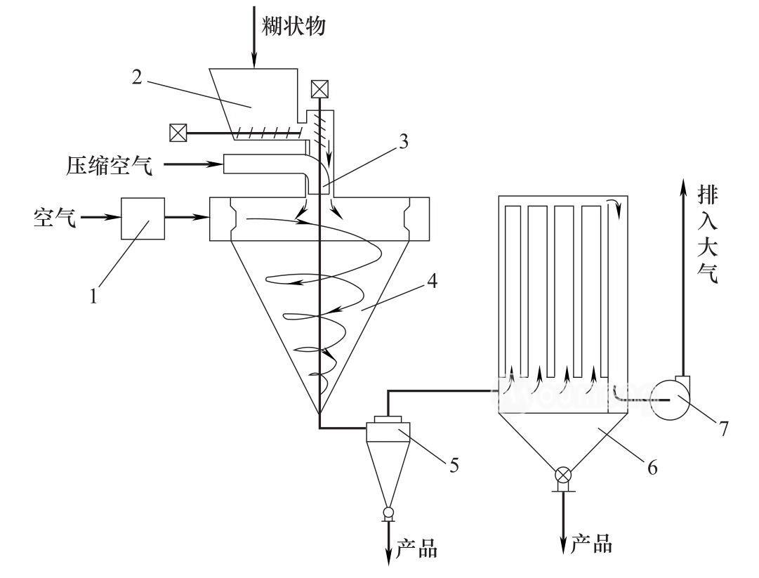 1—空氣加熱器;2—貯罐;3—二流體霧化器;4—噴霧干燥塔;5—旋風(fēng)分離器;6—布袋過(guò)濾器;7—引風(fēng)機(jī)