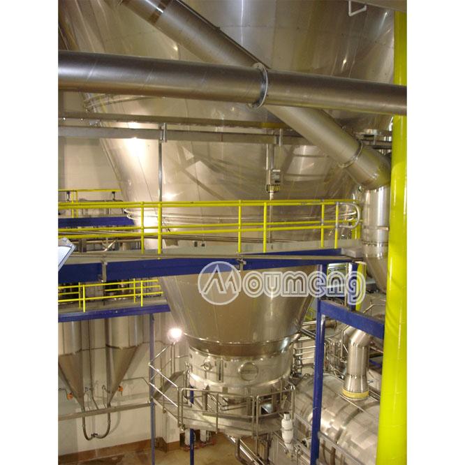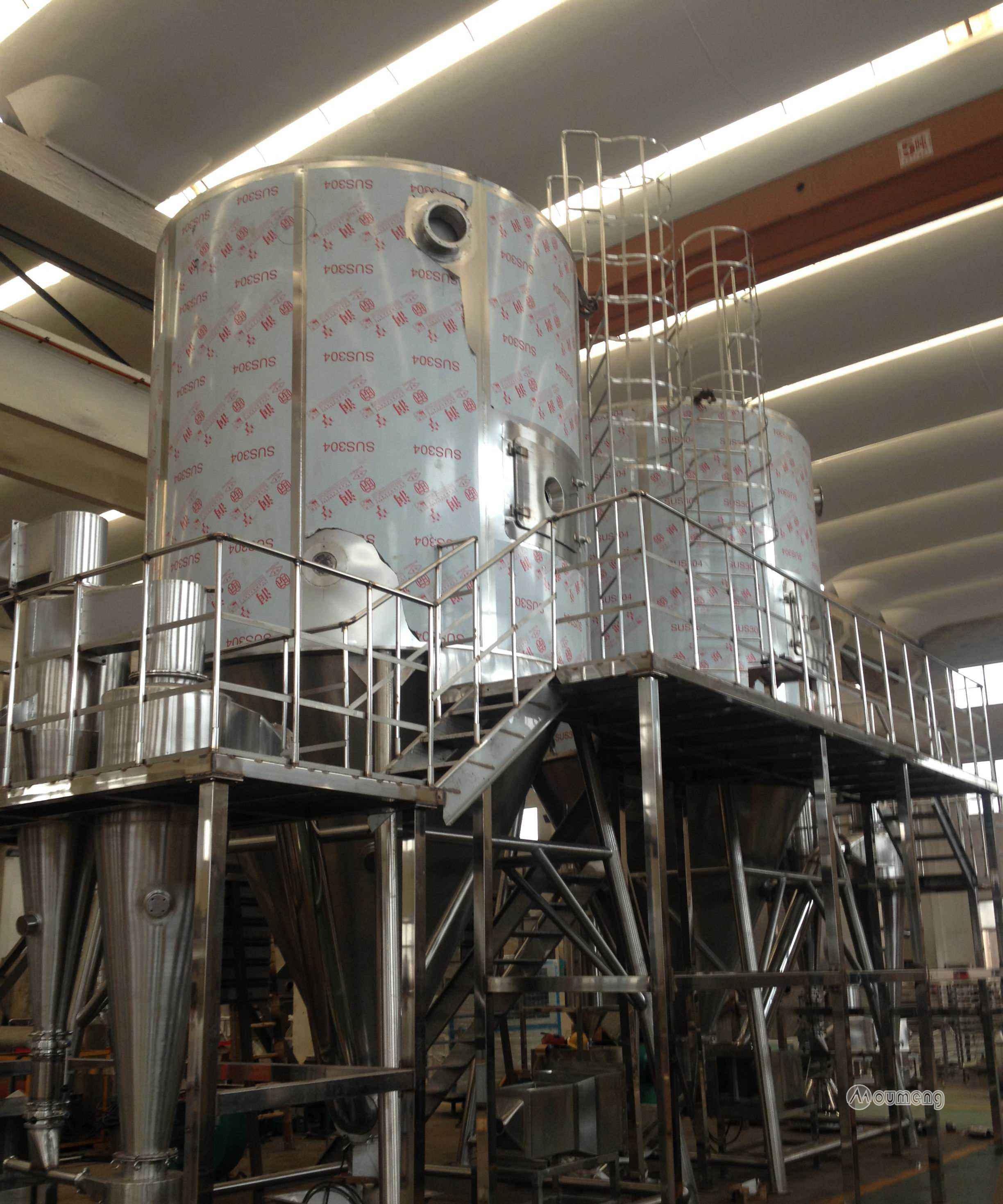 工作原理空氣經過濾和加熱,進入干燥器頂部空氣分配器,熱空氣呈螺旋狀均勻地進入干燥室。料液經塔體頂部的高速離心霧化器,(旋轉)噴霧成極細微的霧狀液珠,與熱空氣并流接觸在極短的時間內可干燥為成品。成品連續地由干燥塔底部和旋風分離器中輸出,廢氣由風機空。